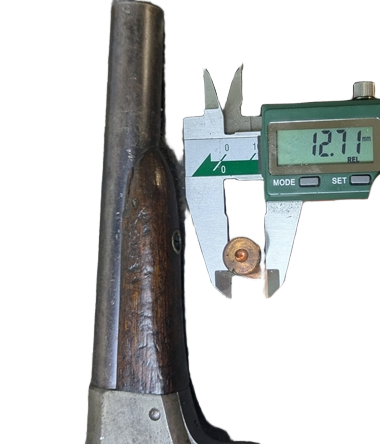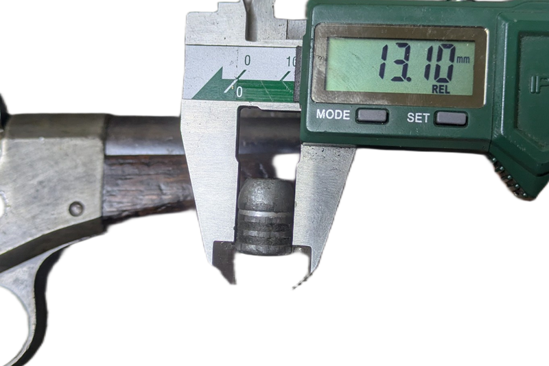Bohužel, informace na "velké síti" se neshodnou ani na průměru střely do této zbraně. Jednoduše si pomůžeme malým trikem. Seženeme kalibr (kulatinu, ale pozor, nepoškrábat hlaveň) o takovém průměru, který jde volně vsunout do hlavně. Říkám sice volně, ale myslím tím tak aby lícoval v hlavni co nejtěsněji. Tak získáme rozměr, takzvaný "land diameter" nebo také někdy nazývaný "bore diameter". V mém případě se do hlavně mé pistole dal vložit mosazný váleček o průměru 12,7 mm. K tomuto rozměru připočteme 2x hloubku drážek a máme rozměr střely. Hloubka drážek se neměří příliš dobře, ale věřte že to bude kolem 0,15 az 0,2 mm tedy přičteme zhruba 0,4 mm. Střelu jsem zvolil 13,1mm. Když to bude o něco málo více nic se neděje. Měkké olovo je měkké olovo...