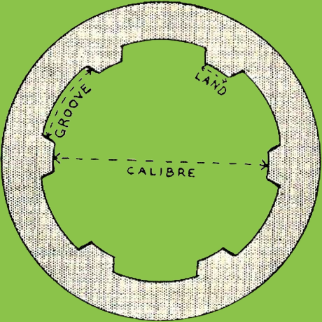 Bohužel, informace na "velké síti" se neshodnou ani na průměru střely do této zbraně. Jednoduše si pomůžeme malým trikem. Seženeme kalibr (kulatinu, ale pozor, nepoškrábat hlaveň, použijeme mosaz nebo bronz) o takovém průměru, který jde volně vsunout do hlavně. Říkám sice volně, ale myslím tím tak aby lícoval v hlavni co nejtěsněji. Tak získáme rozměr, takzvaný "land diameter" na obrázku je to rozměr "calibre". V mém případě se do hlavně pistole dal vložit mosazný váleček o průměru 12,7 mm. K tomuto rozměru připočteme 2x hloubku drážek a máme rozměr střely. Hloubka drážek se neměří příliš dobře, ale věřte že to bude kolem 0,15 az 0,2 mm tedy přičteme zhruba 0,4 mm. Střelu jsem zvolil 13,1mm. Když to bude o něco málo více nic se neděje. Měkké olovo je měkké olovo...